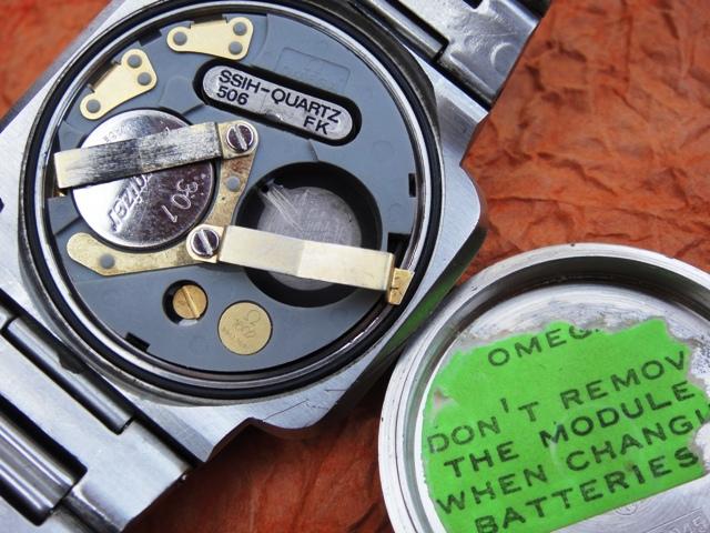 Frontier modules used in Omegas and Hamiltons were fitted with better quality plastic carriers with batteries secured with screwed-on battery clamps. You might expect these clamps to be pushed from the edge to unhook and raise but such an approach might lead to breaking the ceramic substrate as a result of to much pressure from the batteries. Always unscrew the clamps, change batteries, hook the clamps at the edge of the case and then fit the screws to secure the batteries. Don't worry about the sticker on the inside of the caseback that suggests not to remove the module from the case. There is nothing that can be damaged as there is no exposed circuitry. Read more about Frontier in the following 1603 review.